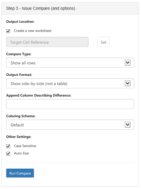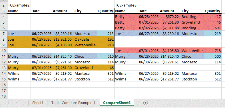 With these defaults, clicking “Run Compare” adds a new worksheet and shows our two tables, side-by-side: